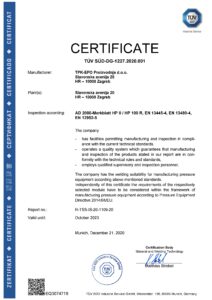 Sukladno tome, tvrtka je implementirala sustav upravljanja kvalitetom i kompetencije nužne za proizvodnju tlačne opreme prema PED 2014/68/EU (NN079/16) sukladno normama i pravilnicima kako slijedi: