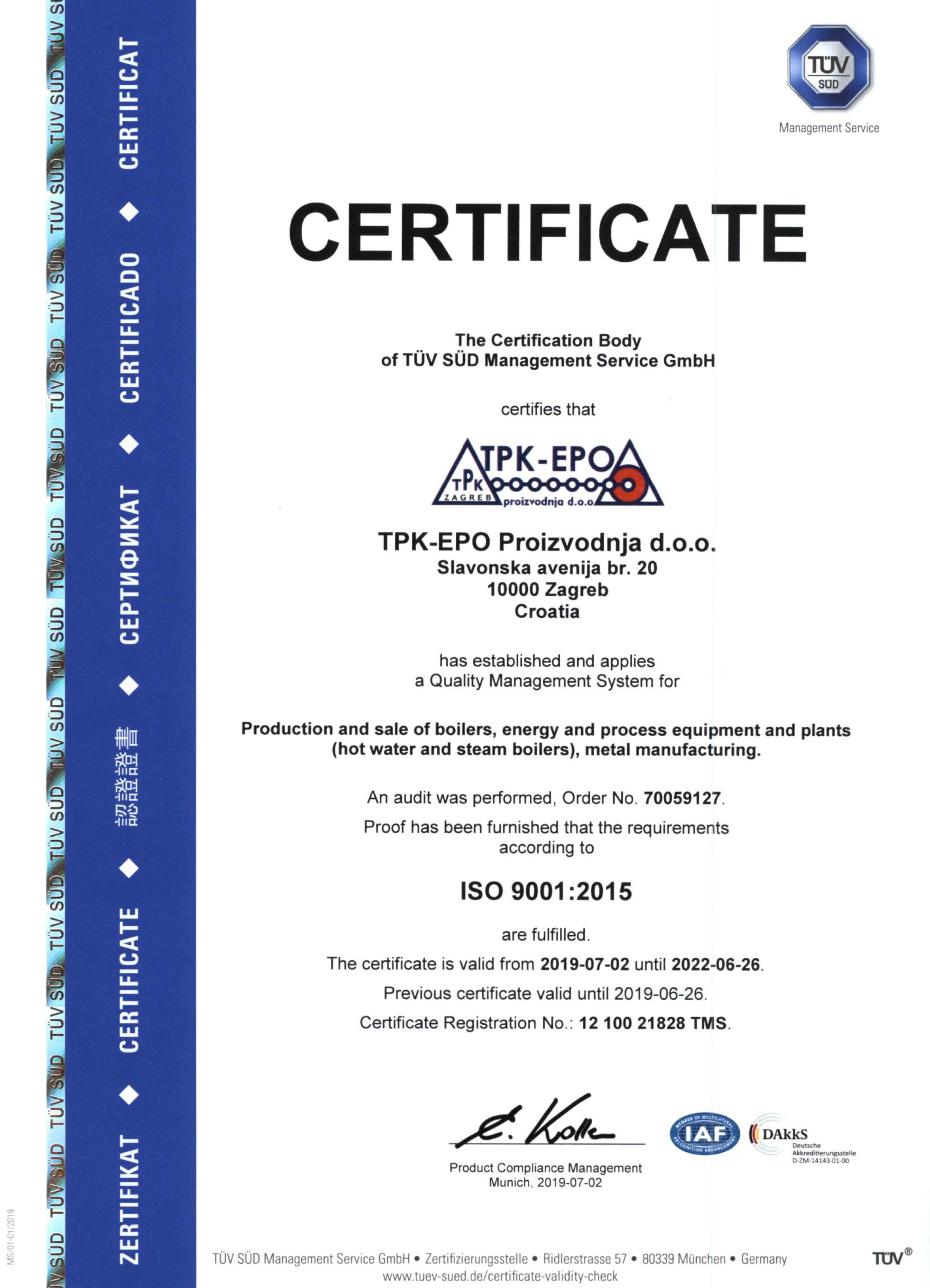 TPK-EPO Proizvodnja d.o.o. svojim opredjeljenjem ka ostvarivanju kvalitete, sukladnosti proizvoda i zadovoljenja zahtjeva i zadovoljstva kupca, jeuspostavila, implementrila i certificirala svoj sustav upravljanja kvalitetom koji je predmet neprektidnog unapređenja.